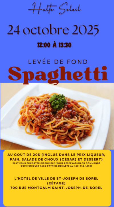 Il y aura un dîner spaghetti au profit de la Halte Soleil le vendredi 24 octobre prochain à la salle municipale de la ville de Saint-Joseph-de-Sorel.