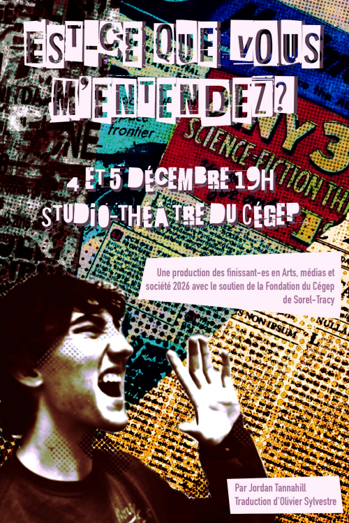 Cette session, les cégépiens présentent une pièce de théâtre dans le cadre de leur cours « art vivant : pratique contemporaine ». Ils adaptent à la scène : « Est-ce que vous m’entendez ? » de Jordan Tannanhill, traduite par Olivier Sylvestre.