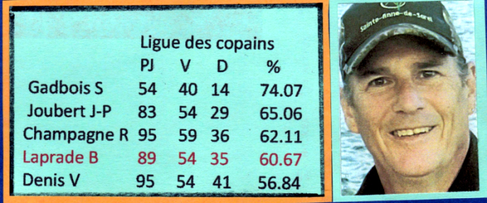 Billard à la Taverne 207- Les Alouettes du capitaine Guy Nadeau domine le classement (245) suivi des Expos de Phil Pouliot (238), des Yankees de Pit Chalifoux (234), des Nordiques de Richard Tailly (232), des Chiefs de Bilou Bardier (223) et des Éperviers de Pascal Joyal (208).