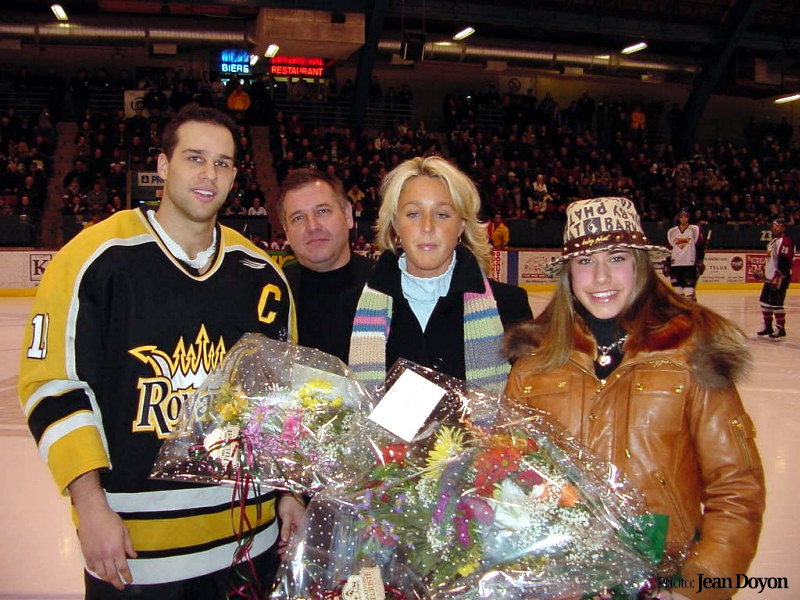 Présentation de la Championne en 2004, et de sa coach Annie Barabé, au centre de la patinoire du Colisée Cardin avant un match des Royaux, en compagnie de Jamie Leinhos et de feu Richard St-Germain.