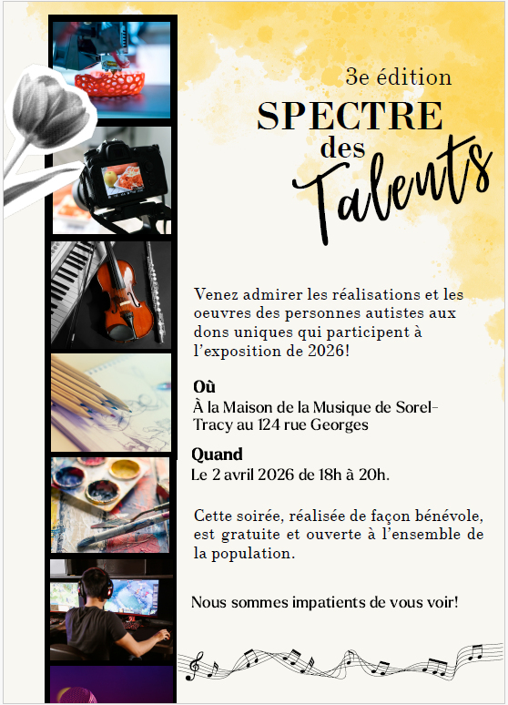 Cet événement unique et inspirant met en lumière les talents de personnes autistes de notre région. Depuis la première édition, nous avons eu le plaisir de découvrir de multiples participants dont les exploits touchaient plusieurs domaines créatifs.