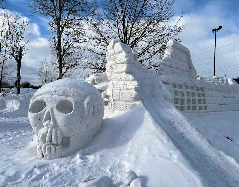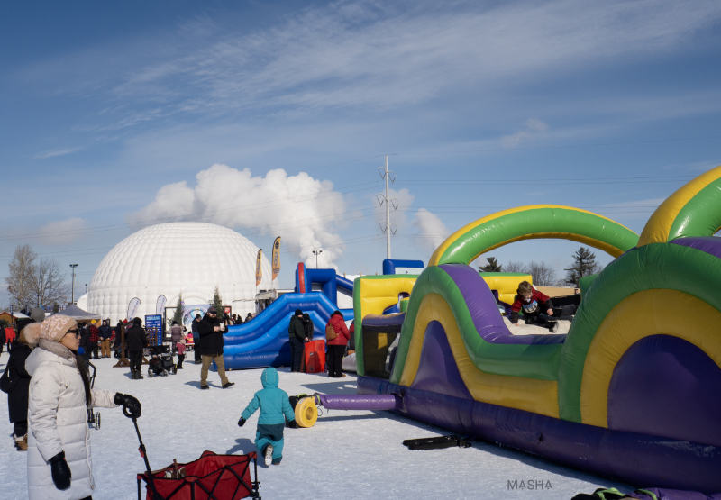 Glissade géante, jeux gonflables, fermette MaJo, démonstration de bûcherons, mascottes, maquillage pour enfants et sculptures sur neige.