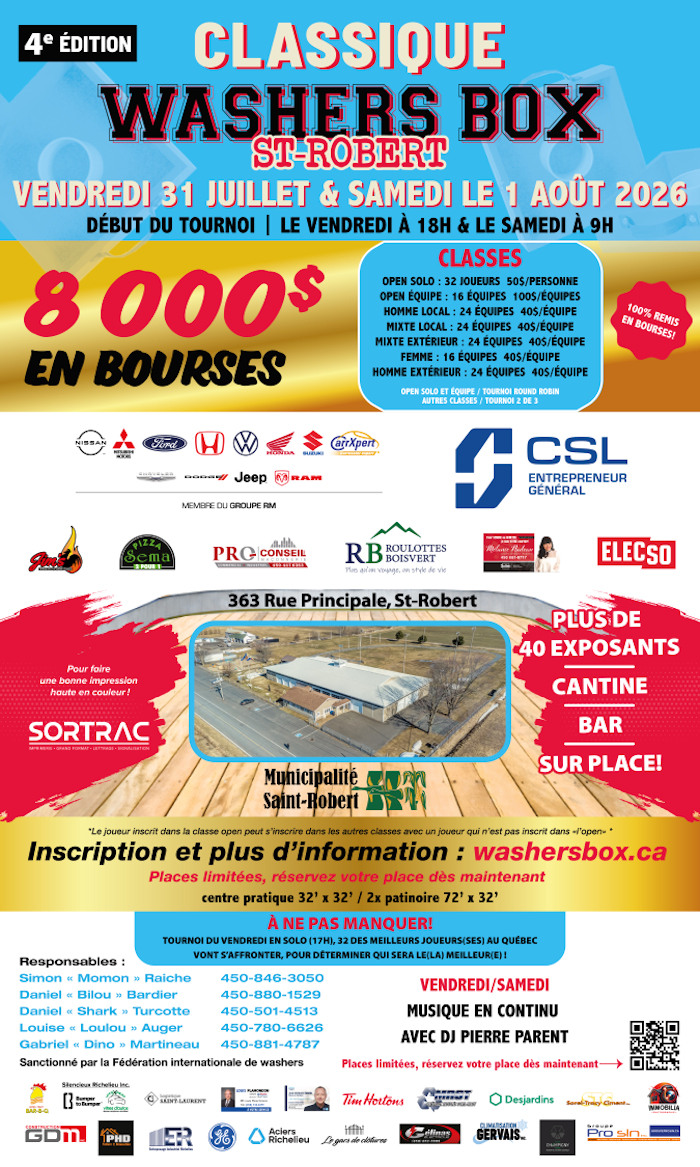La Classique WashersBox de Saint-Robert est un événement annuel dédié à la promotion du washersbox, combinant compétition sportive, marché local et rassemblement communautaire. L’événement met en valeur les talents locaux tout en offrant une plateforme dynamique aux participants et exposants.