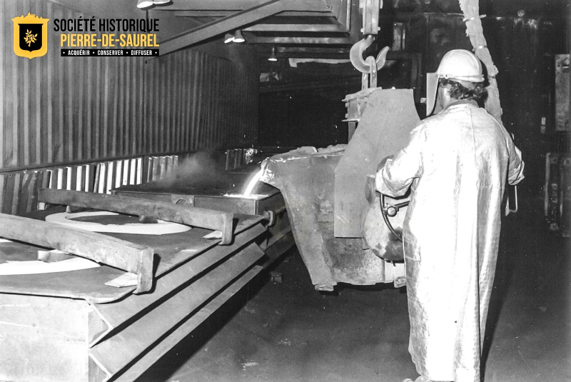 Sur cette photographie d’archives, on aperçoit un ouvrier à l’œuvre sur le convoyeur en boucle fermée. Une innovation qui a permis à la Fonderie Laperle de prendre de l’expansion. Crédit : SHPS – Fonds Les 2 Rives, P102, S2, SS1, SSS9, D30