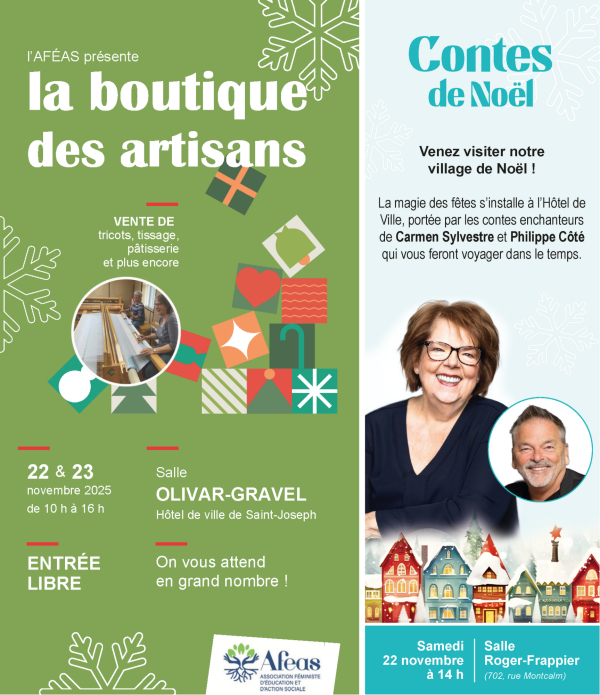 La boutique des artisans de l’AFEAS Venez découvrir le savoir-faire local et dénicher des cadeaux uniques et faits main à la boutique des artisans organisée par l’AFEAS. Une belle occasion de soutenir les créatrices de chez nous tout en préparant vos emplettes des Fêtes dans une ambiance conviviale et chaleureuse.