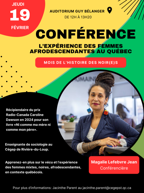 Dans le cadre du mois de l’histoire des Noir(e)s, le Cégep de Sorel-Tracy accueillera Magalie Lefebvre Jean qui a reçu le prix Radio-Canada Caroline Dawson dont l’objectif est de récompenser l’ouvrage d’une personne écrivaine francophone issue de la diversité.