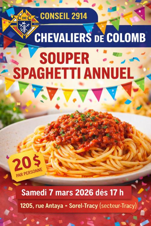 Le Conseil 2914 Saint-Joseph-Tracy des Chevaliers de Colomb convie la population à son souper spaghetti annuel, qui se tiendra le samedi 7 mars 2026 dès 17 h, à la salle des Chevaliers de Colomb située au 1205, rue Antaya, secteur Tracy, à Sorel-Tracy.