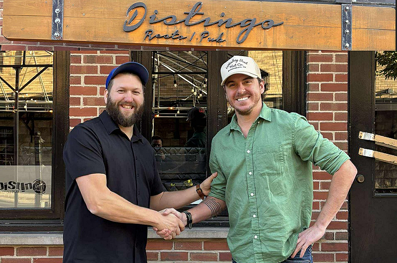 Photo tirée de la page Facebook Distingo Resto/Pub, où l’on aperçoit Benoit Courchesne posant fièrement avec l’ancien propriétaire, Rémy Salvail.