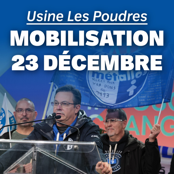 Alors que « la direction préparera son réveillon de Noël », souligne le Syndicat des Métallos, les travailleurs de l’usine Les Poudres font face à une perte d’emploi brutale. Le syndicat appelle donc à une forte mobilisation pour démontrer que ces familles ne seront pas laissées seules durant cette période difficile.