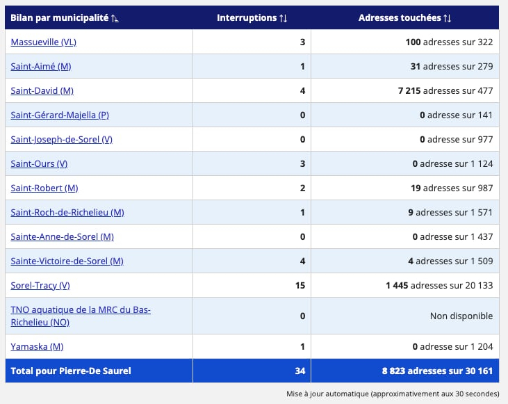 (Équipe STM, 17 mars 2026) – Les vents forts causent actuellement plusieurs pannes de courant sur le territoire de la MRC de Pierre-De Saurel. On compte 8 311 abonnés privés d’électricité à 9 h ce mardi matin. En Montérégie, plus de 87 000 foyers étaient privés d’électricité, et plus de 270 000 dans l’ensemble de la province, selon le bilan d’Hydro-Québec.