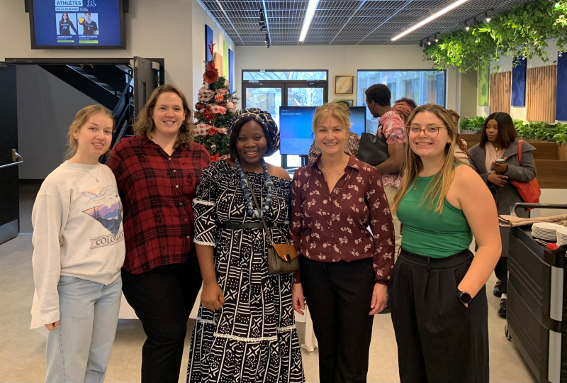 De gauche à droite : Karelle Farley, technicienne en loisirs – Jacinthe Parent, conseillère pédagogique – volet international – Charleine Tuedjo Tegninko, étudiante en Techniques de bureautique – Andrée Chartier, enseignante en Techniques de bureautique et Techniques d’Administration et de Gestion – Justine Bouley, étudiante en Sciences humaines et responsable du socio-culturel à l’AGEECST. (Crédit photo : Cégep de Sorel-Tracy Comité organisateur de l’évènement)