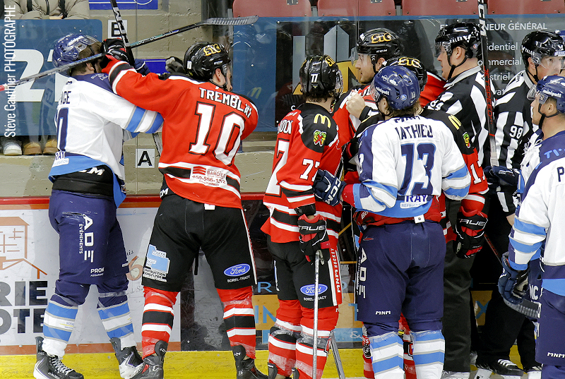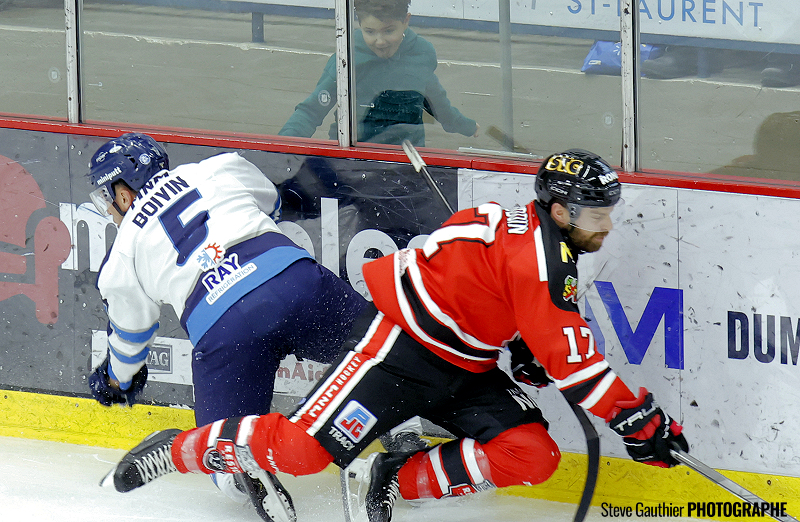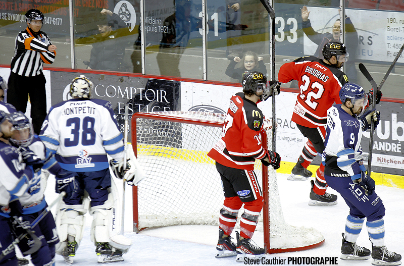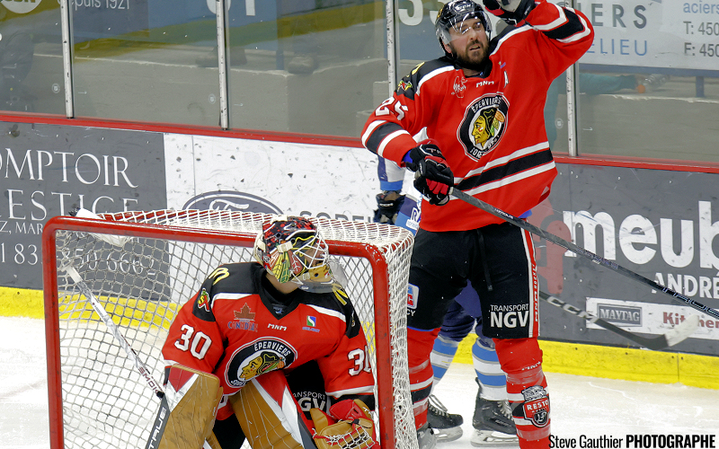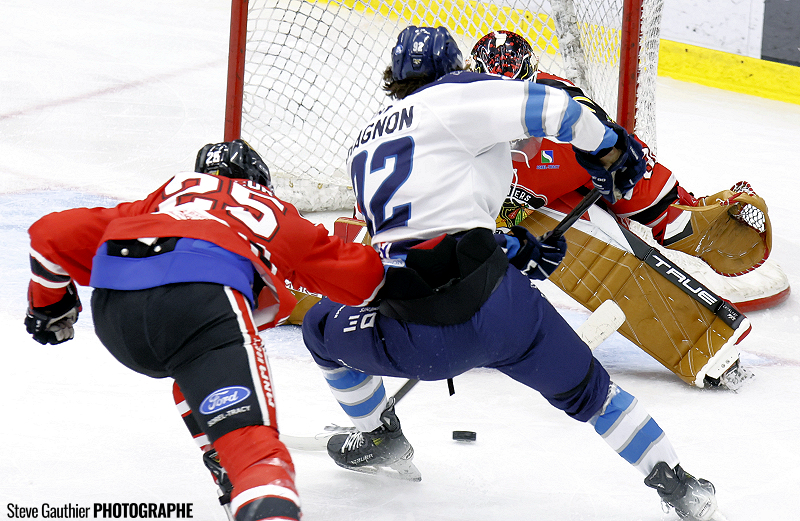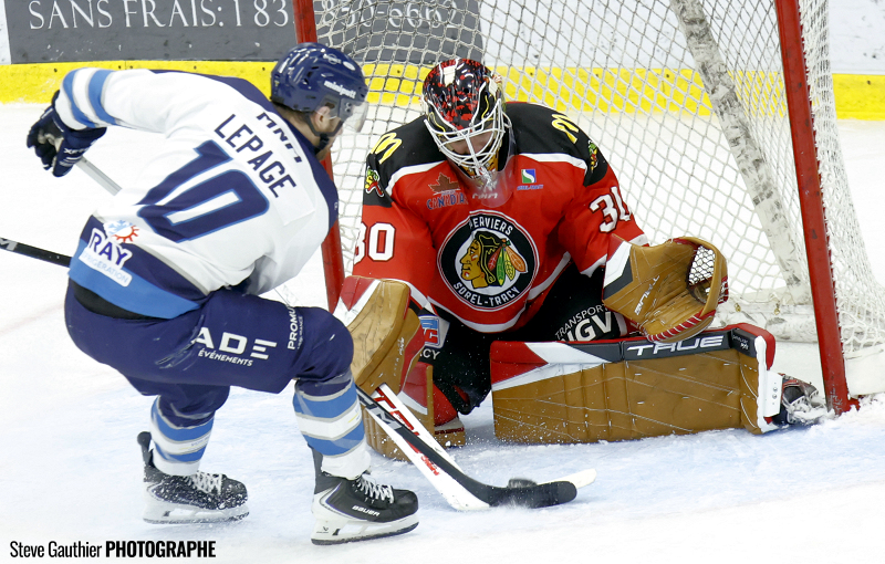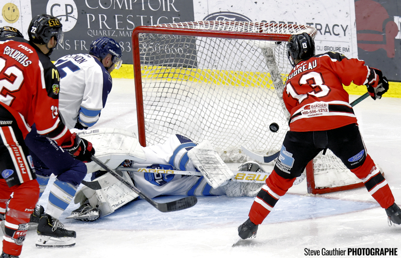 Bombardé de 18 tirs dans cette période médiane, le gardien de Sorel-Tracy a finalement dû s’avouer vaincu avec un peu plus de deux minutes à faire, lorsqu’Olivier Garneau a rejoint Gabriel Denis oublié dans l’enclave qui a nivelé le pointage.