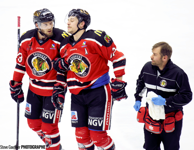 Au cours du premier vingt, Jérôme Gravel des Marquis a écopé d’une punition majeure de 5 minutes pour avoir donner un coup de genou à Antoine Waked, qui est resté un long moment sur la patinoire. Waked a quitté le jeu, mais est revenu plus tard, sauf qu’on voyait bien que son coup de patin n’était pas comme à l’habitude. Mais, on le connait, Waked est un dur, pas question de rater ce match.