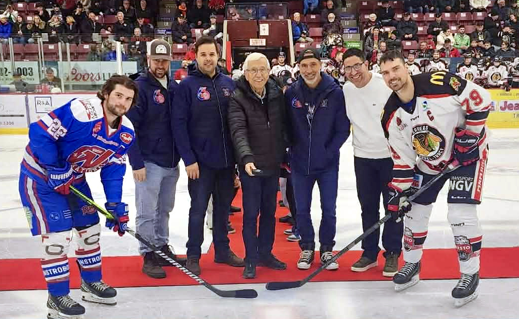 Les Éperviers ont souligné le record absolu de longévité pour un parlementaire à Ottawa avec 15 057 jours en fonction, du député fédéral du Bloc Québécois, Louis Plamondon, 82 ans, pour une mise au jeu officielle. Avec ce record absolu, M. Plamondon a dépassé sir Wilfrid Laurier qui détenait cette marque. Photo: courtoisie