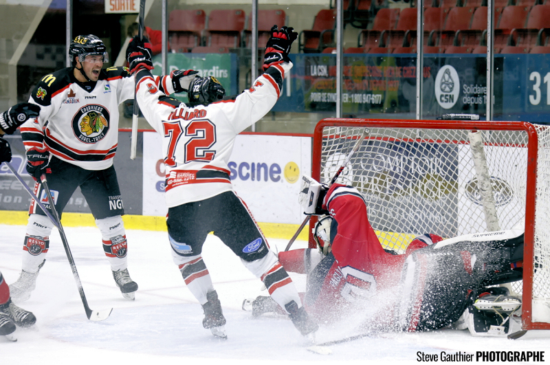 À 6:43 en 3e période, Shawn Boudrias pousse le disque derrière le gardien (4e) (Antoine Waked, Marc Beckstead), sur un jeu de puissance et Dany Potvin (2e) redonne l’avance aux Hawks (Émile Villiard, Philippe Desrosiers) et c’est 4 à 3 Sorel.