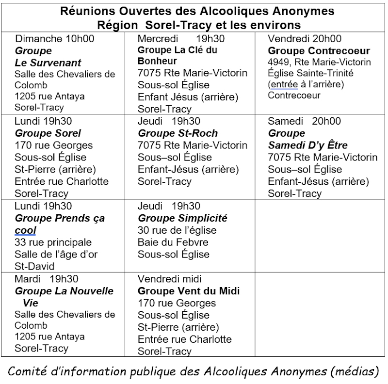 RÉUNIONS OUVERTES DES ALCOOLIQUES ANONYMES EN MONTÉRÉGIE