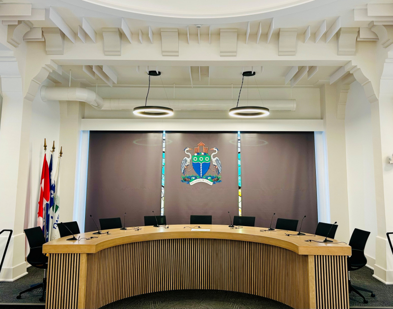 Ces travaux ont notamment permis la mise à niveau des systèmes de ventilation et de chauffage, ainsi que la réfection de la toiture de l’hôtel de ville avec des matériaux choisis pour limiter les îlots de chaleur. De plus, une nouvelle salle de toilette adaptée pour les personnes à mobilité réduite est maintenant accessible. Enfin, le design a aussi été pensé pour conserver les éléments patrimoniaux tels que le vitrail et la voûte du plafond et pour en revaloriser certains, dont le mobilier en bois massif et le revêtement de plancher.