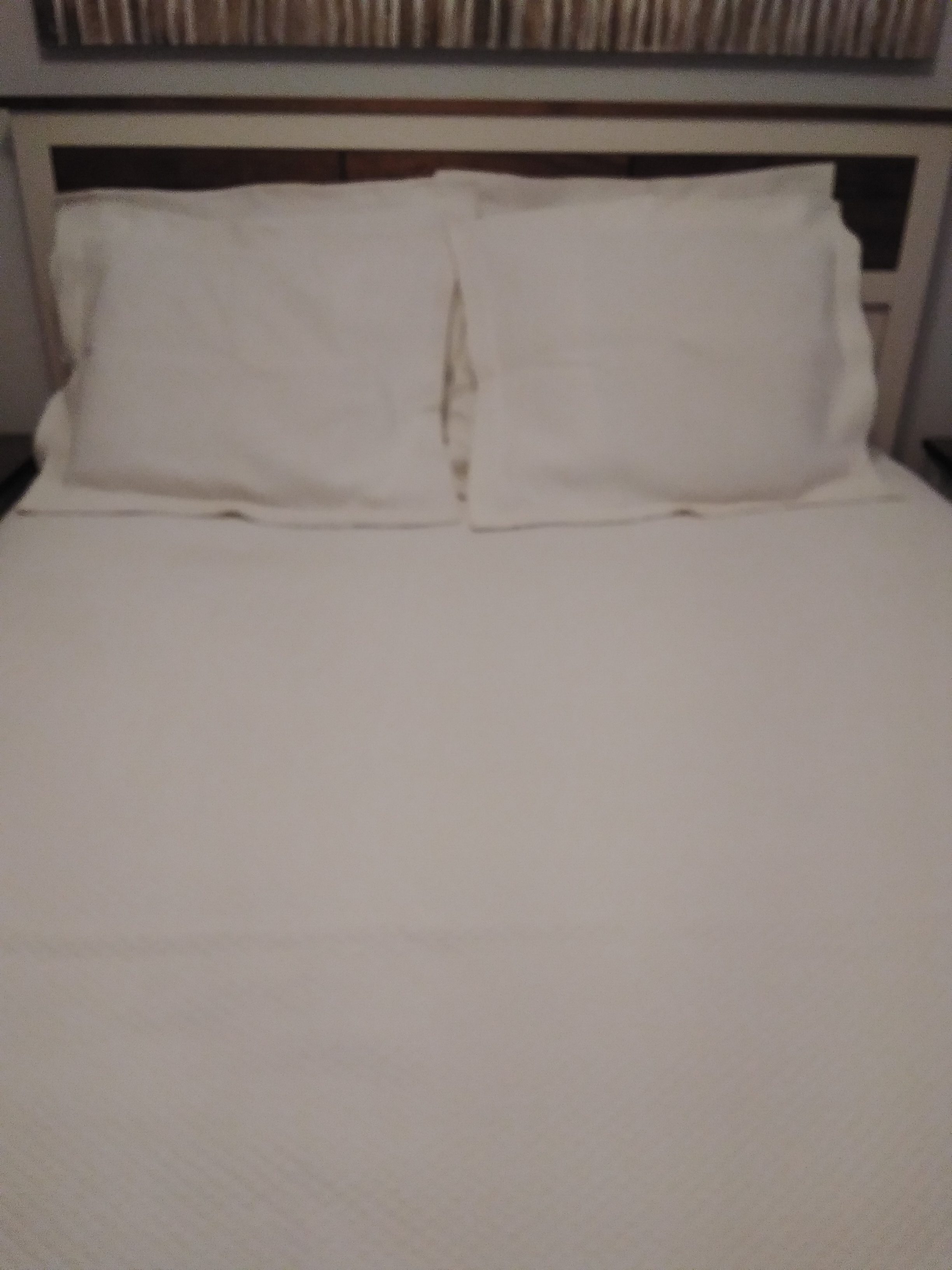 Couvre_lit de couleur blanc crème. Comprend jupette, 4 couvre oreillers. 2 grands et 2 petits. Couvre lit 92 x 102 pouces