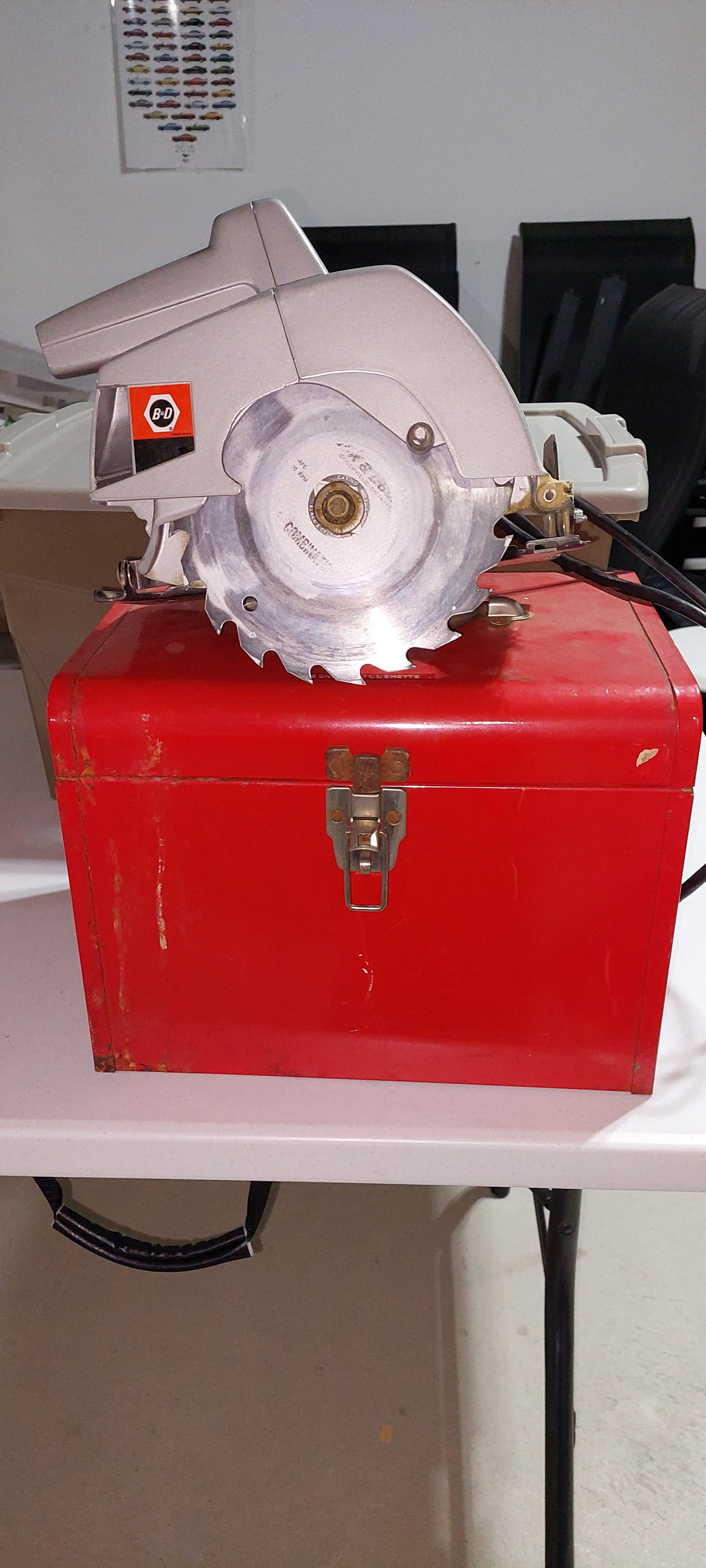 Scie rotative Black and Decker électrique avec coffre de transport en très bonne état.