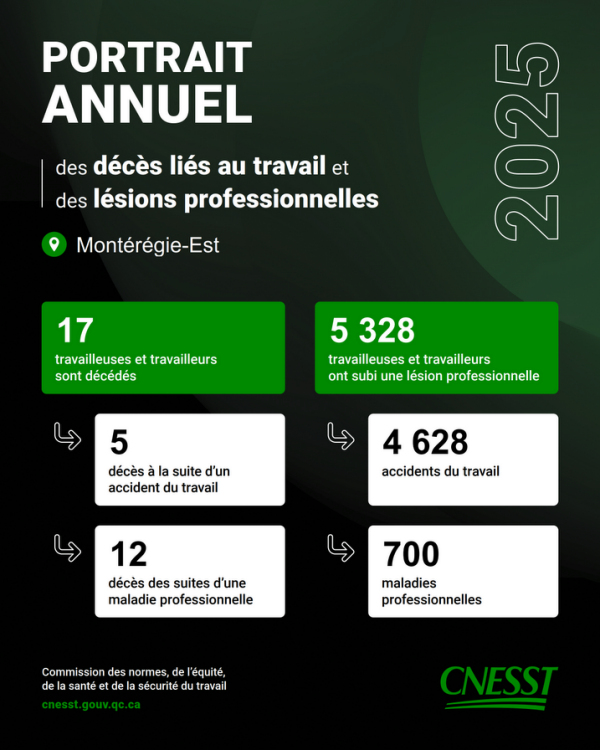 En 2025, dans la région de la Montérégie-Est, 4 628 personnes ont subi une lésion en raison d’un accident du travail et 700 ont développé une maladie professionnelle. Au total, 5 328 lésions professionnelles ont été recensées, ce qui représente une diminution de plus de 5 % comparativement à 2024.