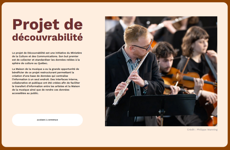 Le 17 juin 2024, le ministère de la Culture et des Communications du Québec en vertu de son programme d’Aide aux projets pour le soutien à la standardisation des données, octroyait à la Maison de la musique de Sorel-Tracy, suite à l’évaluation pour laquelle les objectifs et critères du programme étaient respectés, une aide financière de 50 000$ dollars pour couvrir une partie des frais liés à la réalisation du projet d’une base de données standardisée et d’une interface de découverte de données.