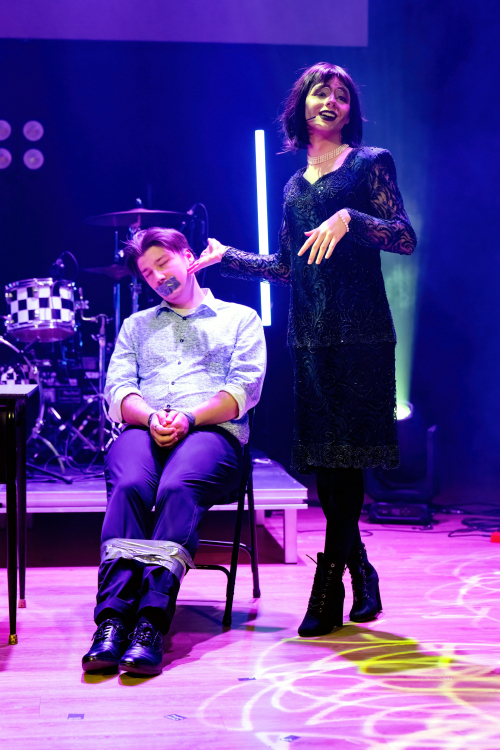 Photo : Clitorélise (William Maranda) montrant au public son amant ligoté : Jimmy McNeil Crédit : Jean-François Mongeon