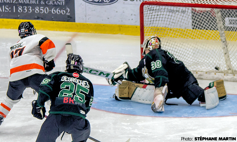 Les deux cerbères Zachary Poitras (Magog) et Édouard Salvas (Saint-Hyacinthe) stoppent tout au premier engagement même s’ils n’ont pas été fort occupés. Ils ont fait les arrêts lorsqu’il le fallait.
