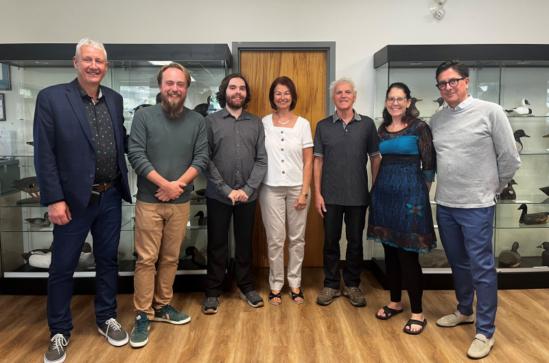 Le nouvel employé de la Société historique Pierre-de-Saurel, Alexis Paulet (centre gauche), entouré par le directeur général, Geoffrey Shayne Packwood (deuxième à gauche), ainsi que les membres du conseil d’administration de la Fondation d’Histoire Pierre-De Saurel. De gauche à droite : Richard Pelletier, Geoffrey Shayne Packwood, Alexis Paulet, France Cournoyer, Jean-Michel Leclaire, Jacinthe Claveau et René Chevalier.