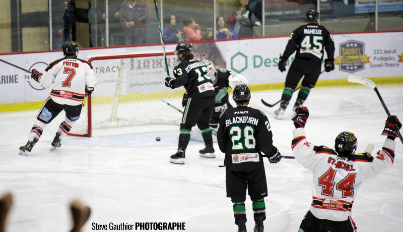 Les Éperviers se réveillent en fin de première, sur un jeu de puissance quand André Bouvet-Morissette marque son 2e de la saison, flanqué d’Olivier Hinse et de Gabryel Paquin-Boudreau.