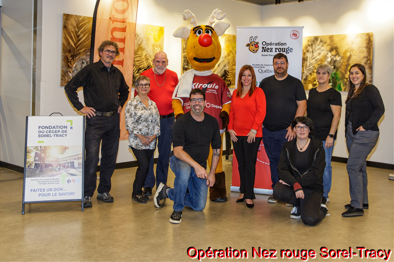 De gauche à droite, quelques membres du comité organisateur de l’Opération Nez rouge Sorel-Tracy entourant Myriam Arpin, directrice générale de la Fondation du Cégep de Sorel-Tracy et la mascotte Nez Rouge : François Lefebvre, France Massicotte, agente d’administration à la Fondation, Michel Laroche, Jean-Marc Mainella, Joël Dionne, Andréanne Lefebvre, Claudia Lafond, adjointe à la Fondation. Crédit photo : Jean-Marc Mainella.