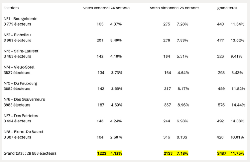 (Rédaction) – Dans le cadre de l’élection municipale de Sorel-Tracy 2025, le vote par anticipation s’est déroulé le vendredi 24 octobre et le dimanche 26 octobre, de 12 h à 20 h. Voici les résultats du vote transmis par le président d’élection: