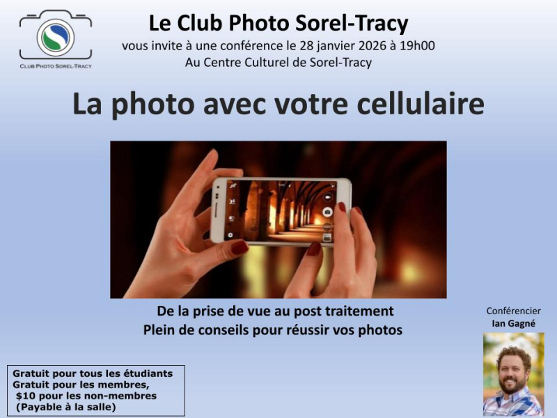 Le Club Photo Sorel-Tracy (CPST) vous invite à participer à une conférence sur la photographie avec cellulaire.