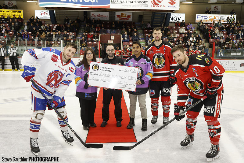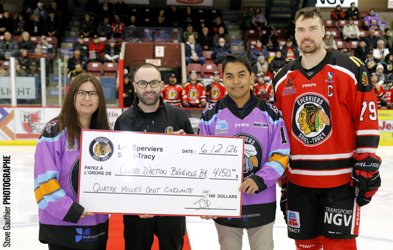L’organisation des Éperviers de Sorel-Tracy on remis au Centre d’Action Bénévole un montant de 4150 $ suite à la vente des chandails spéciaux (mauves) portés par les Éperviers lors d’une rencontre au Colisée Cardin au mois de décembre dernier.